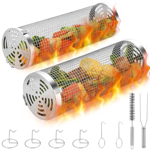 Roterande grillkorg, Banaone 2 st runda grillkorgar i rostfritt stål med fäste, rengöringsborste, bärbar utomhus camping BBQ nätrör för kött, grönsaker