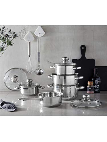 Huvud kastrullset Josie av rostfritt stål – induktionskrukor med hällkant, literskala och glaslock – 14 delar