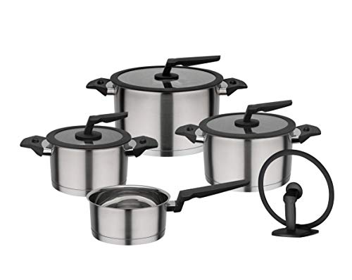 HEPF Kastrullset Nelo 9 delar i rostfritt stål I induktion krukor set med lock, intelligent dräneringshjälp och integrerad siktfunktion I 4 krukor med glaslock + 1 kastrull