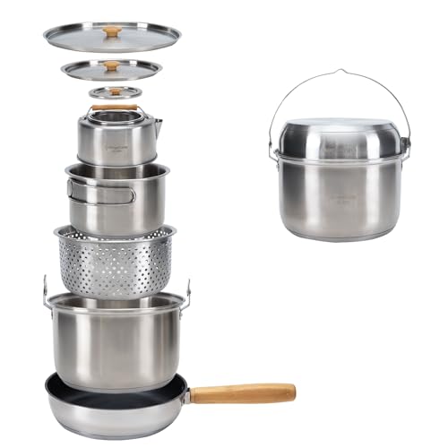 KingCamp Camping matlagningsset med tät korg, campingköksredskap i rostfritt stål, non-stick-belagd panna, camping kastrullset för camping, vandring, picknick med vattenkokare
