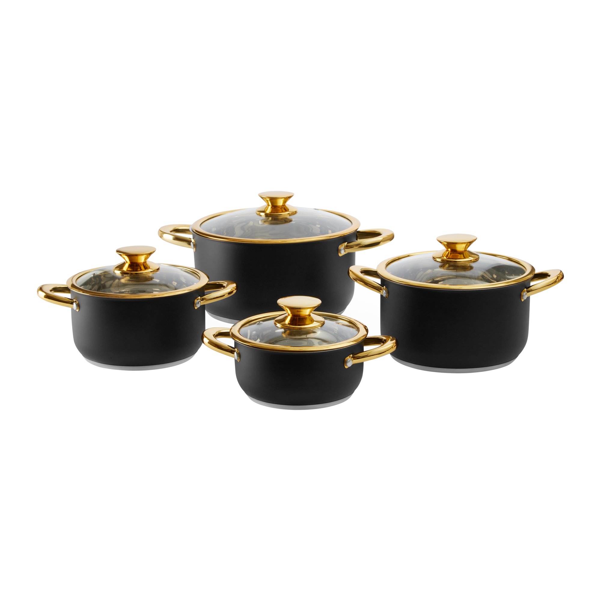 Spring kastrullset GourMET, 4 delar, flerskiktade krukor med lock av rostfritt stål, ugnssäkert, med inre skala, kastrull Ø 16, 20, 24 cm, gryta Ø 20 cm, svart
