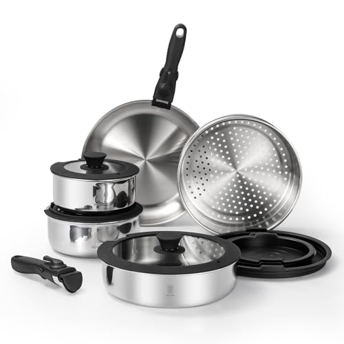 ROYDX 18/10 rostfritt stål grytset med avtagbara handtag, 16 delar stapelbart kastrullset med ångkokare, 24 cm/26 cm stekpannor med kastrull för alla spisar inklusive. Induktion och gas, ugnssäker