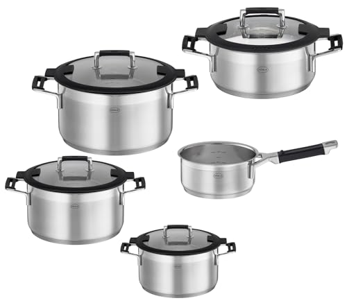 RÖSLE SILENCE PRO kastrullset 5 delar, universell kastrullset med 3 kastruller, 1 stekpanna och 1 kastrull, 18/10 rostfritt stål, glaslock, invändig skala, induktions- och diskmaskinssäker