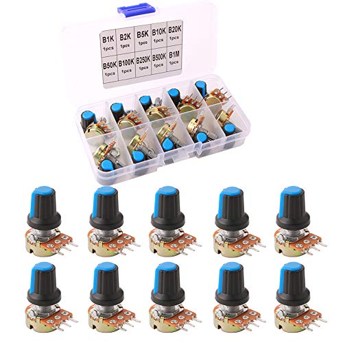 QitinDasen 10 st premium linjär roterande konisk potentiometer, justerbar 3-terminals roterande potentiometer, med knopplock och bricka (5 värde: B10K, B50K, B100K, B500K, B1M Ohm)