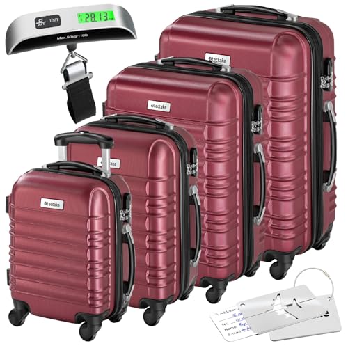 tectake® Resväska Set: 4 Hårda Resväskor Med Hjul, 360° Roterande Hjul, Kombinationslås, Förstärkta Hörn, Bagagevåg, Bagagetaggar, Handbagage Väska - Vinröd