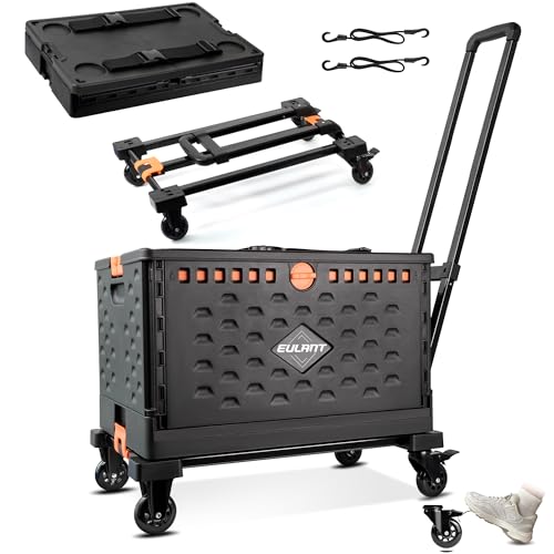 EULANT 2-i-1 hopfällbar handlastbil med 60 l hopfällbar låda och lock, verktygstransportvagn med 360° roterande hjul och 2 elastiska rep, låda på hjul med justerbart handtag och broms