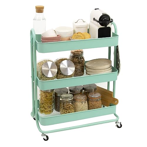 Craftelier - Stor organisationsvagn i metall med 3 brickor | 4 360° roterande hjul med 2 bromsar (mint, stor)