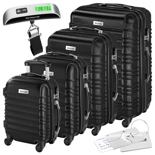 tectake® Resväska Set: 4 Hårda Resväskor Med Hjul, 360° Roterande Hjul, Kombinationslås, Förstärkta Hörn, Bagagevåg, Bagagetaggar, Handbagage Väska - Svart