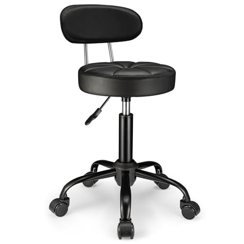 FNZIR Roterande pall på hjul, höjdjusterbar, rullpall med ryggstöd, PU-lädersittdyna, svart
