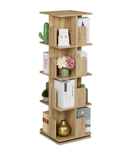 Relaxdays Bokhylla, 360 graders roterbar, 4 nivåer, träutseende, böcker, HBT: 125,5 x 39 x 39 cm, vardagsrum roterande hylla, natur