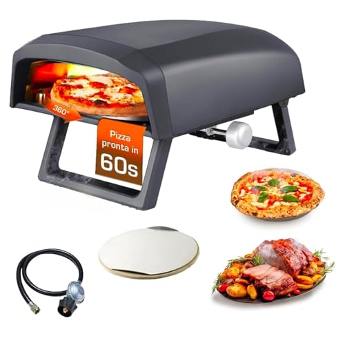 Avilia Pizzaugn med 360° roterande platta, 64 x 44 x 31,5 cm, tillverkad av robust rostfritt stål med dubbel brännare 4 000 W, bärväska med låsbara ben och gasregulator 1 m