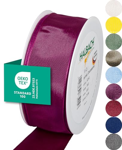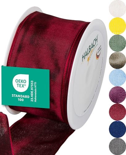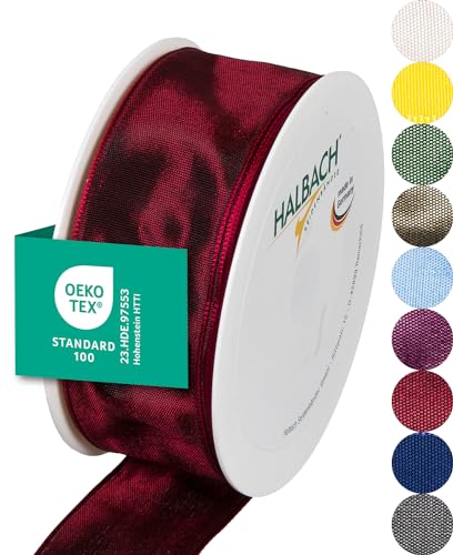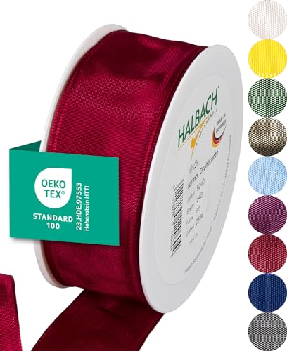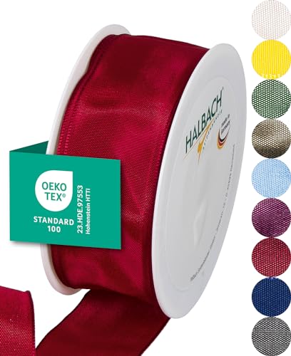 Halbach sidenband premium presentband med trådkant | bredd 40 mm längd 25 m | Öko-Tex 100 certifierat band | Taftband Made in Germany, färg: vinröd