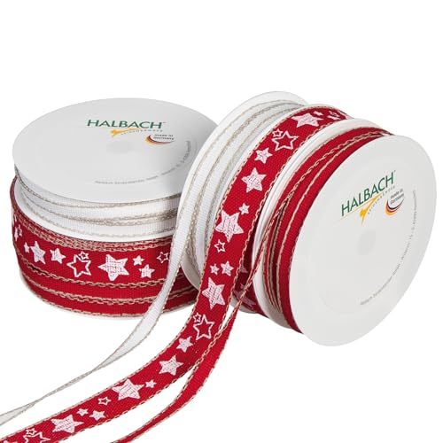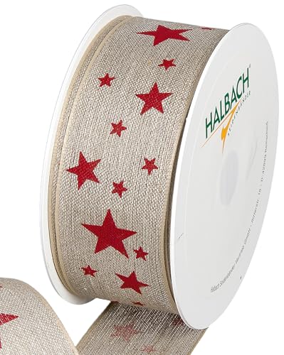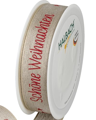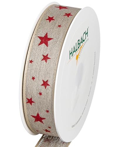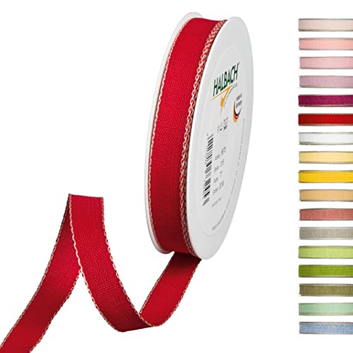 Halbach Sidenband premium presentband jul av linne | bredd 25 mm längd 15 m | julband med tråd för presenter och julgran | Tillverkad i Tyskland, färg: natur/röd