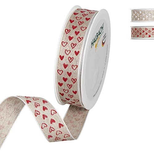 Halbach sidenband, tryckt linneband, hjärtan med trådkant, bredd 25 mm längd 15 m, presentband för mors dag, konfirmation eller nattvard, gör-det-själv dekorativa artionsband, färg: natur/röd
