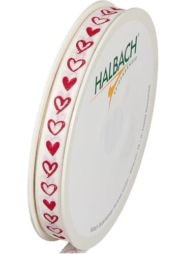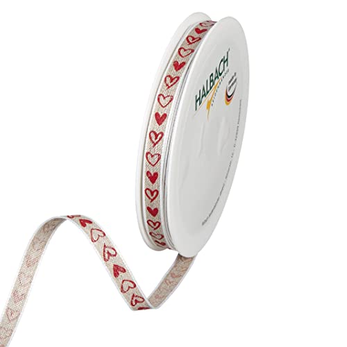 Halbach sidenband, tryckt linneband, hjärtan med trådkant, bredd 10 mm längd 15 m, presentband för mors dag, konfirmation eller nattvard, gör-det-själv dekorativa artionsband, färg: natur/röd