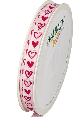 Halbach sidenband presentband "hjärtan" | bredd 10 mm längd 20 m | tryckband med hjärtmotiv | perfekt band för bröllop eller alla hjärtans dag | färg: ljusrosa/röd