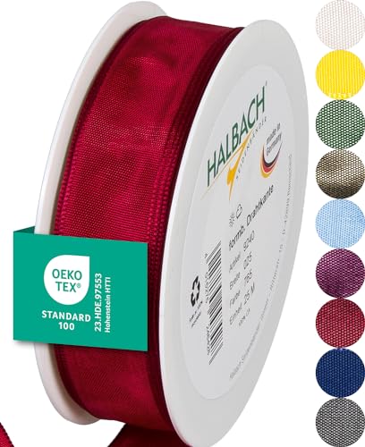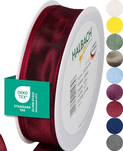 Halbach sidenband premium presentband med trådkant | bredd 25 mm längd 25 m | Öko-Tex 100 certifierat band | Taftband Made in Germany, färg: vinröd