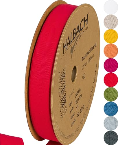 Halbach Sidenband bomullsband 20 mm x m, band för pyssel som metervara, tygband för dekorationer, vävband 100% bomull gör-det-själv hantverk, snedband sömnadsarbeten, färg: röd, 24500