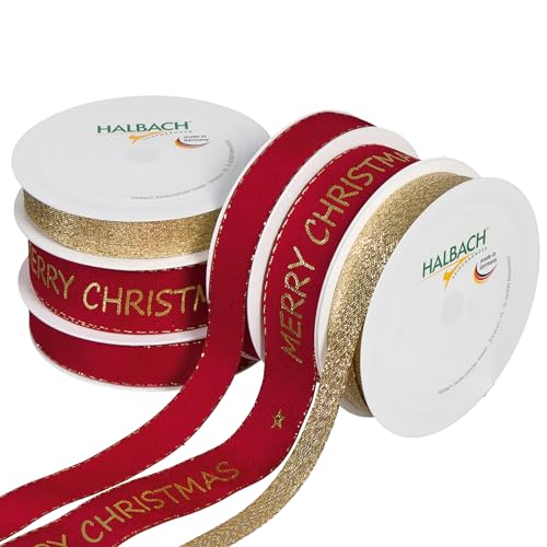 Halbach Sidenband premium presentband jul "Merry Christmas" | Bredd 25 mm längd 18 m | Julband för presenter och julgran | Tillverkad i Tyskland, färg: röd/vit