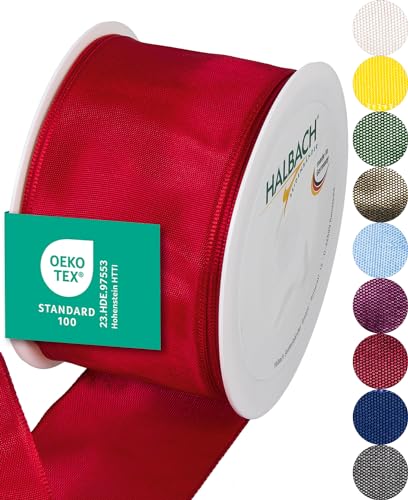 Halbach sidenband premium presentband med trådkant | bredd 60 mm längd 25 m | Öko-Tex 100 certifierat band | Taftband Made in Germany, färg: röd