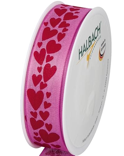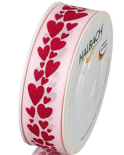 Halbach sidenband presentband "hjärtan" | bredd 25 mm längd 18 m | tryckband med hjärtmotiv | perfekt band för bröllop eller alla hjärtans dag | rosenrosa/röd