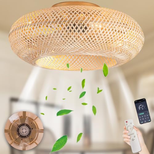 Takfläkt Av Bambu Lampskärm Med Belysning Och Fjärrkontroll Tyst Taklampa Med Fläkt 6-växlad Reversibel Taklampa I Rotting Ljussving Hängande Lampa Rotting Sovrum Lykta Vardagsrum Kök (Color : B)