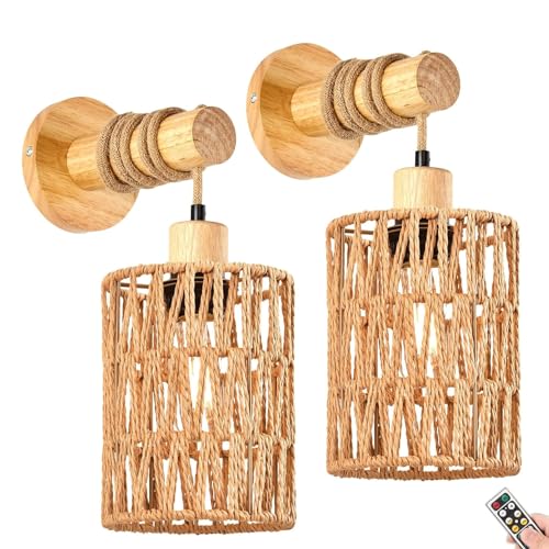 Vägglampa Rotting Hampa Rep med StröMbrytare Och Kontakt Boho Vägglampor Trä Dimbar Rustik Retro Väggspotlight Vintage E27 med 3m Kabel Inomhus Säng Vägg Sänglampa för Vardagsrum Sovrum Hall 2 Stycken
