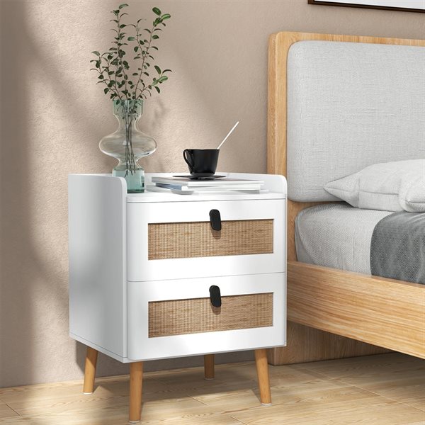 Sängbord nattduksskåp i rotting med 2 lådor sidobord med massiva träben 46 x 33 x 59,5 cm vit + brun
