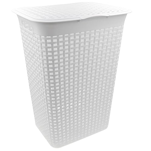 HRB Tvättkorg med lock rotting, 55 liter, tvättförvaring av plast, tvättsorterare (vit, kantig)