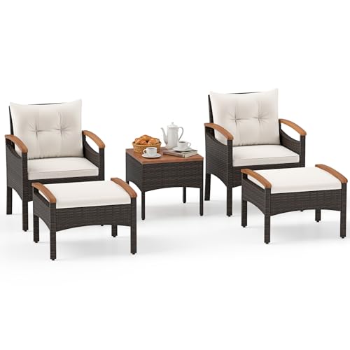 COSTWAY 5 delar rottingmöbelset 2 trädgårdsfåtöljer med fotstöd och sidobord, akaciaträplatta och kudde, trädgårdsstol, rottingfåtölj för trädgård, pool, bakgård