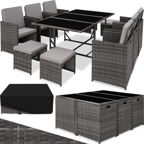 tectake® Stor Matgrupp, Rottingmöbler, Utebord med 3 Glasplattor, 6 Rottingstolar med Sitt- och Ryggdynor, 4 Pallar med Dynor, Sittgrupp med Platsbesparande Kubsystem - Grå