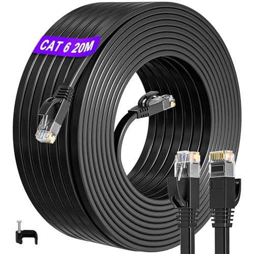 ikbc Cat 6 Kabel 20 m, Platt Nätverkskabel 20m Hög Hastighet Internetkabel, Cat6 Ethernet Kabel 1000Mbps 250MHz RJ45 Kabel Gigabit LAN Kabel 20m Patchkabel Svart för Router (20 Klämmor)