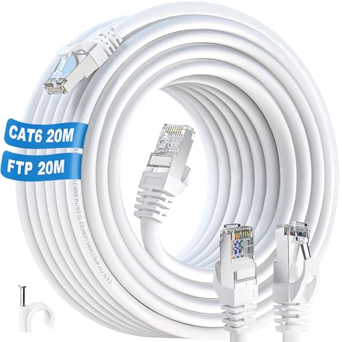 ikbc Cat 6 Kabel 20m Vit, Nätverkskabel 20m Cat 6 Hög Hastighet FTP Skärmning Ethernet Kabel, 1000Mbps 250MHz Internetkabel 20m Cat6 RJ45 LAN Kabel Gigabit Patchkabel för Router Modem (20 Klämmor)