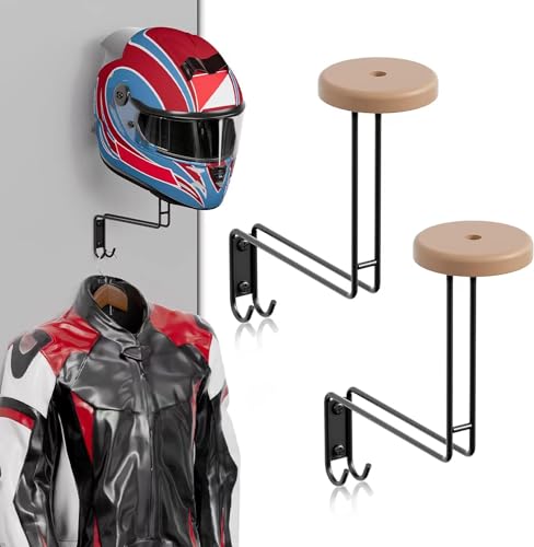 THYGIFTREE Hjälmhållare, vägg, motorcykelhjälmhållare, väggfäste i trä, hjälmhållare för cykelhjälmhållare med krok för rockar, kåpor rugbyhjälm (tvådelat set)