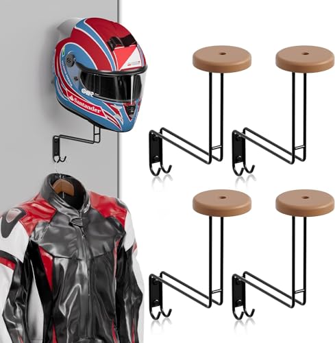 THYGIFTREE Hjälmhållare vägg, 4 stycken motorcykelhjälmhållare, konsol, trä, hjälmhållare för cykelhjälmhållare med krok för rockar, mössor rugbyhjälm