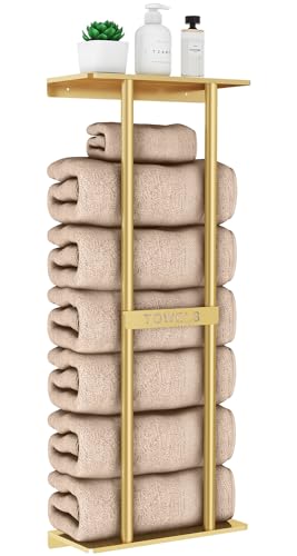 STWWO Handdukshållare, väggmonterad, gyllene stor handdukshylla för badrum, 76 cm, gästhanddukshållare med hylla, förvaring av rullade handdukar, av metall
