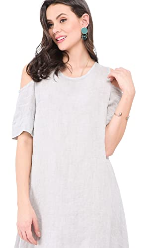 Damklänning 100% linne tillverkad i Italien, flytande lång klänning med rund hals, rullade fickor, marinblå, storlek: XL, Marin, XL