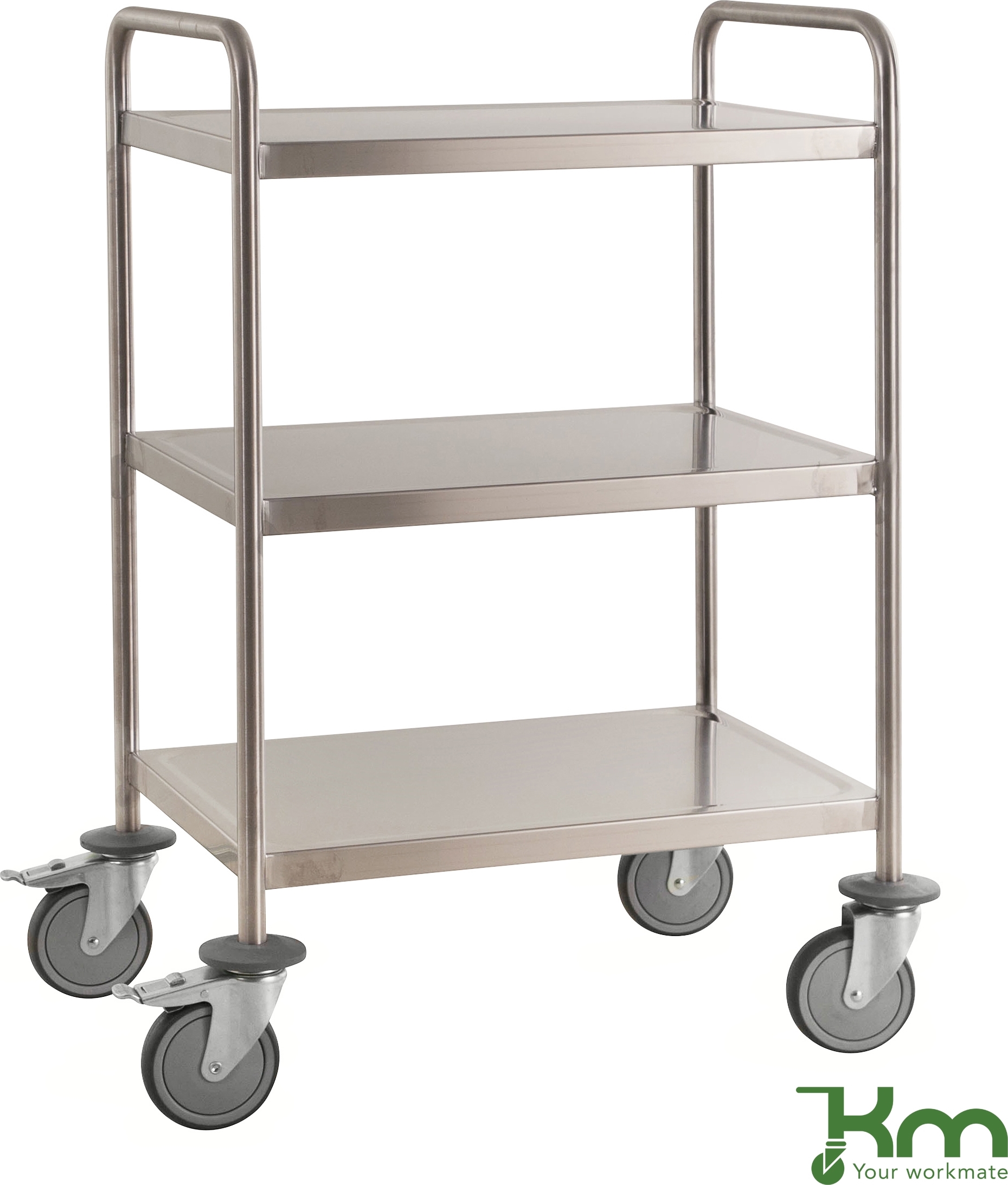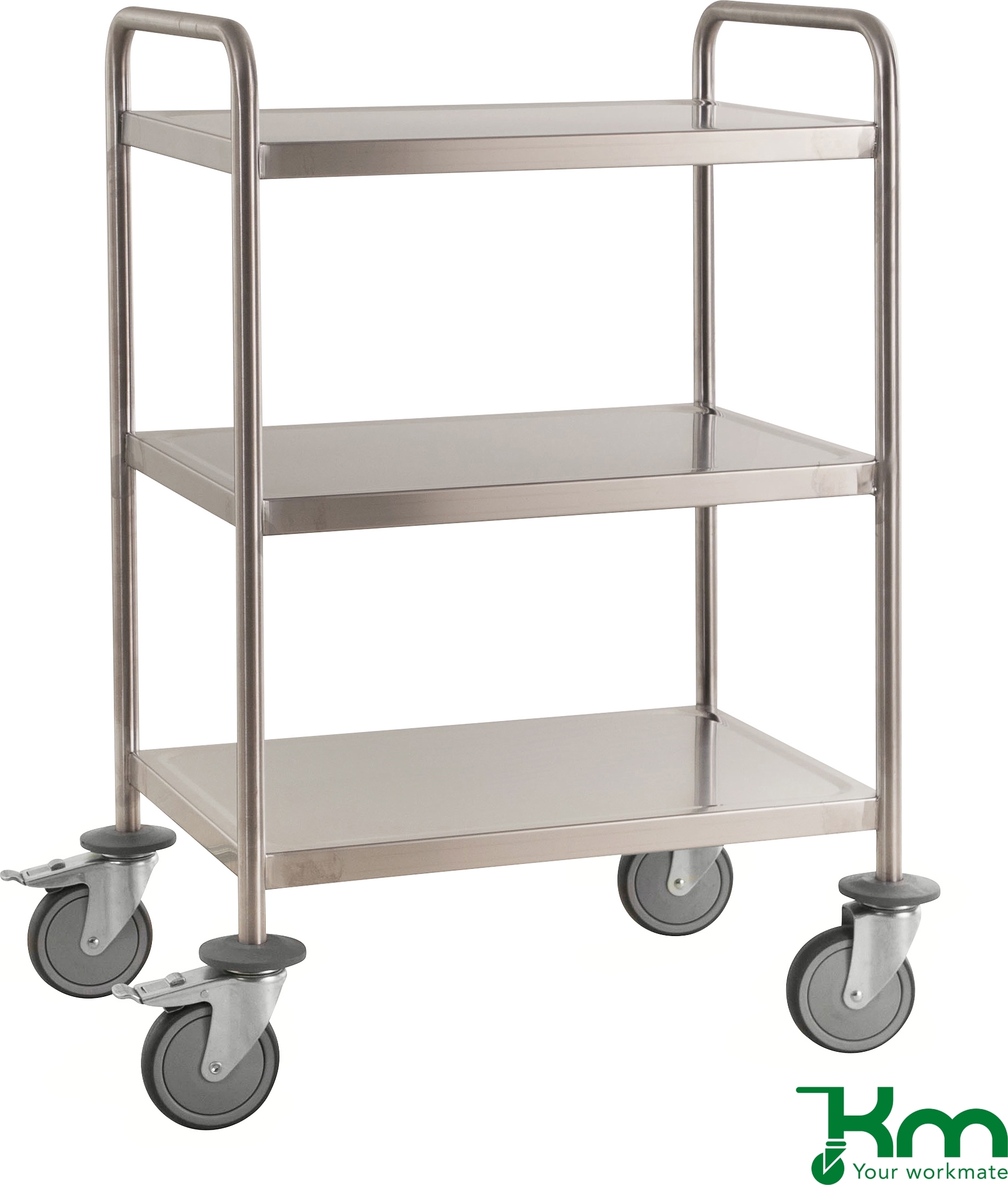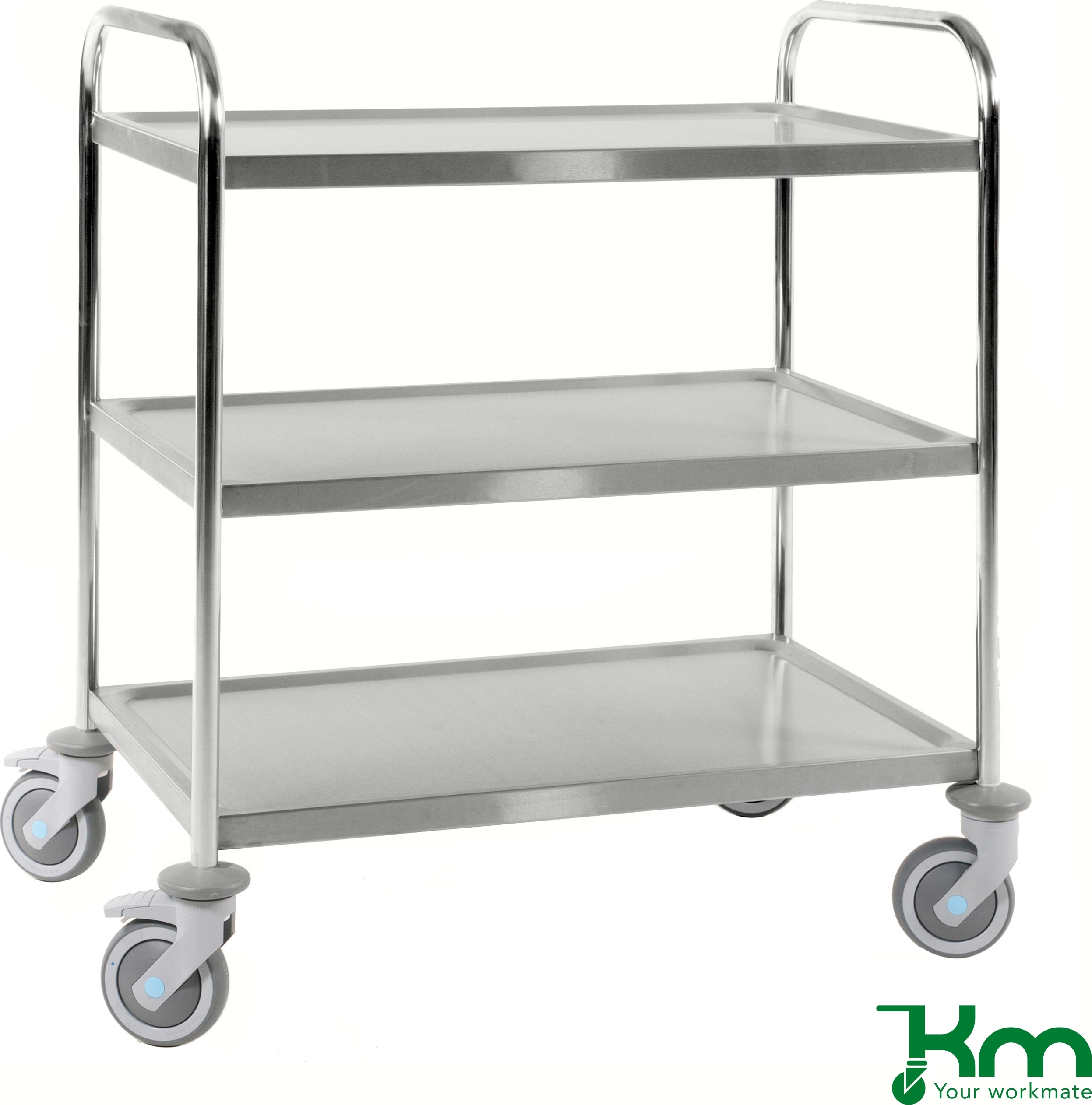 Rostfritt rullbord 3 plan, 910x590x965mm, 100kg, broms, KM60355-S