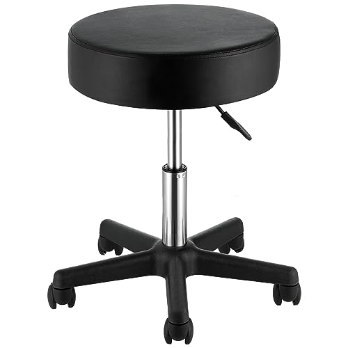 FNZIR Roterande pall på hjul, höjdjusterbar, rullpall med ryggstöd, PU-lädersittdyna, svart