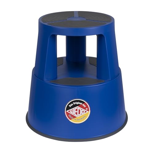 WEDO Super Step Rullpall – robust stegpall av okrossbar plast, TÜV/GS-testad enligt EU-standard EN 14183-F, halkfri och rullbar, tillverkad i Tyskland, höjd ca 43 cm, lastkapacitet 150 kg, blå