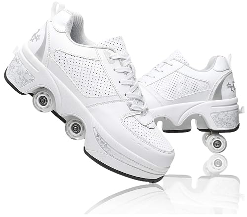 Rullskor, Barn Skateboarding, Multifunktionella 2-i-1 Rullskor Rullskridskor Fyrhjulsskor Mode Sneakers Födelsedagspresent Pojkar och Flickor, Vit blomma, 36 EU