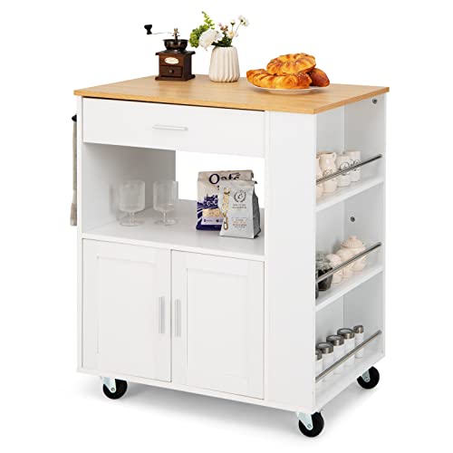 GOPLUS Köksvagn på hjul, serveringsvagn med 1 låda, 2 skåp och vinställ, rullvagn av trä, gummihjul, metallhandtag, i lantlig stil, för kök, restaurang, bar (vit)