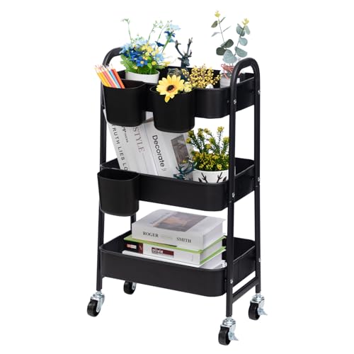 DOEWORKS Förvaringsvagn med 3 nivåer, rullvagn, verktygshyllor i metall med hjul, för kök, smink, badrum, kontor, svart