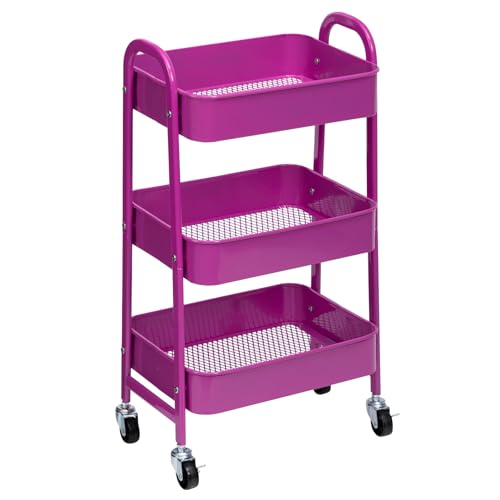 Doeworks Förvaringsvagn med 3 nivåer, rullvagn, vagn, verktygshyllor i metall med hjul och handtag, för kök, smink, badrum, kontor, mörklila