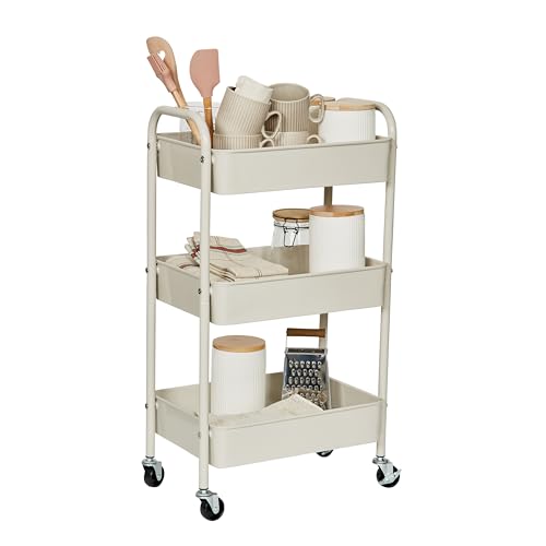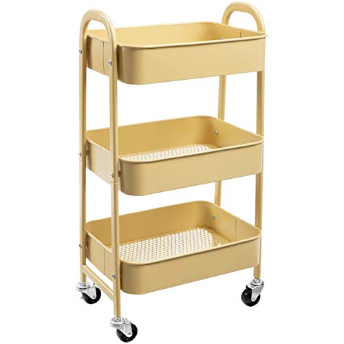 Doeworks Förvaringsvagn med 3 nivåer, rullvagn, vagn, metall, verktygshyllor med hjul och handtag, för kök, smink, badrum, kontor, khaki-gul