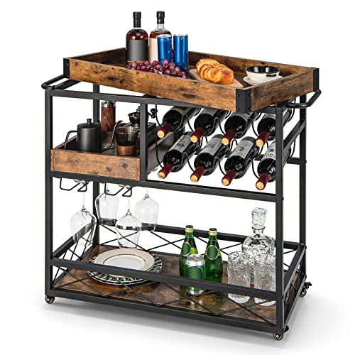 COSTWAY 3 nivåer serveringsvagn med avtagbar bricka, köksvagn med 2 rader glashållare och 8 vinhyllor, rullvagn i trä för kök, matsal och bar, vintage