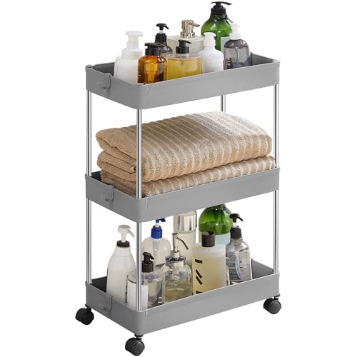 DOEWORKS Förvaringsvagn med 3 Nivåer, Rullvagn, Verktygshyllor i Metall med Hjul, Förvaring Vagn för Kök Smink Badrum Kontor, Grå