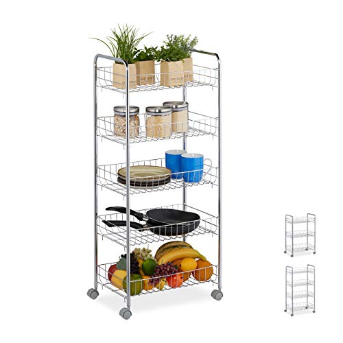 Relaxdays 10030061_350 Rullhylla, 5 våningar, 4 rullar, universell vagn för kök, badrum, kontor, rullvagn HBT 91,5 x 40,5 x 26,5 cm, silver