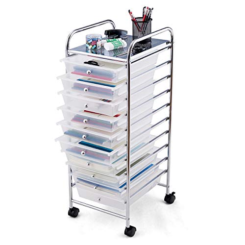 GIANTEX Rullvagn med 10 stapelbara lådor, lådvagn badrumsvagn köksvagn med låsbara hjul, förvaringsvagn hushållsvagn metallram för kök kontor (transparent)