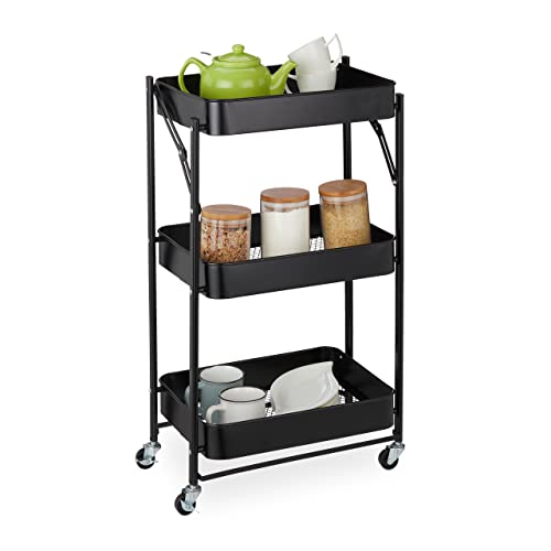 Relaxdays Rullvagn, 3 nivåer, HxBxD: 77,5 x 45,5 x 29,5 cm, vikbar, 2 bromsar, 4 krokar, köksvagn, metall, svart